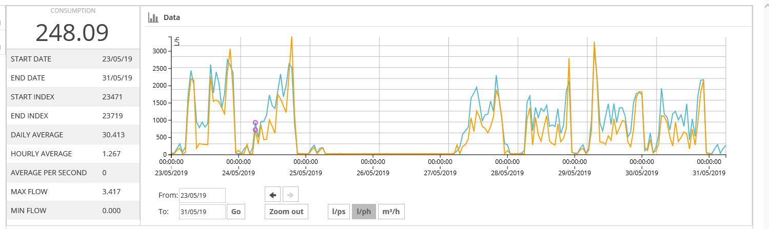 Trade effluent flow data can be hosted on our webportal alongside water supply data with the ability to set high usage alarms and track usage every 15 minutes: